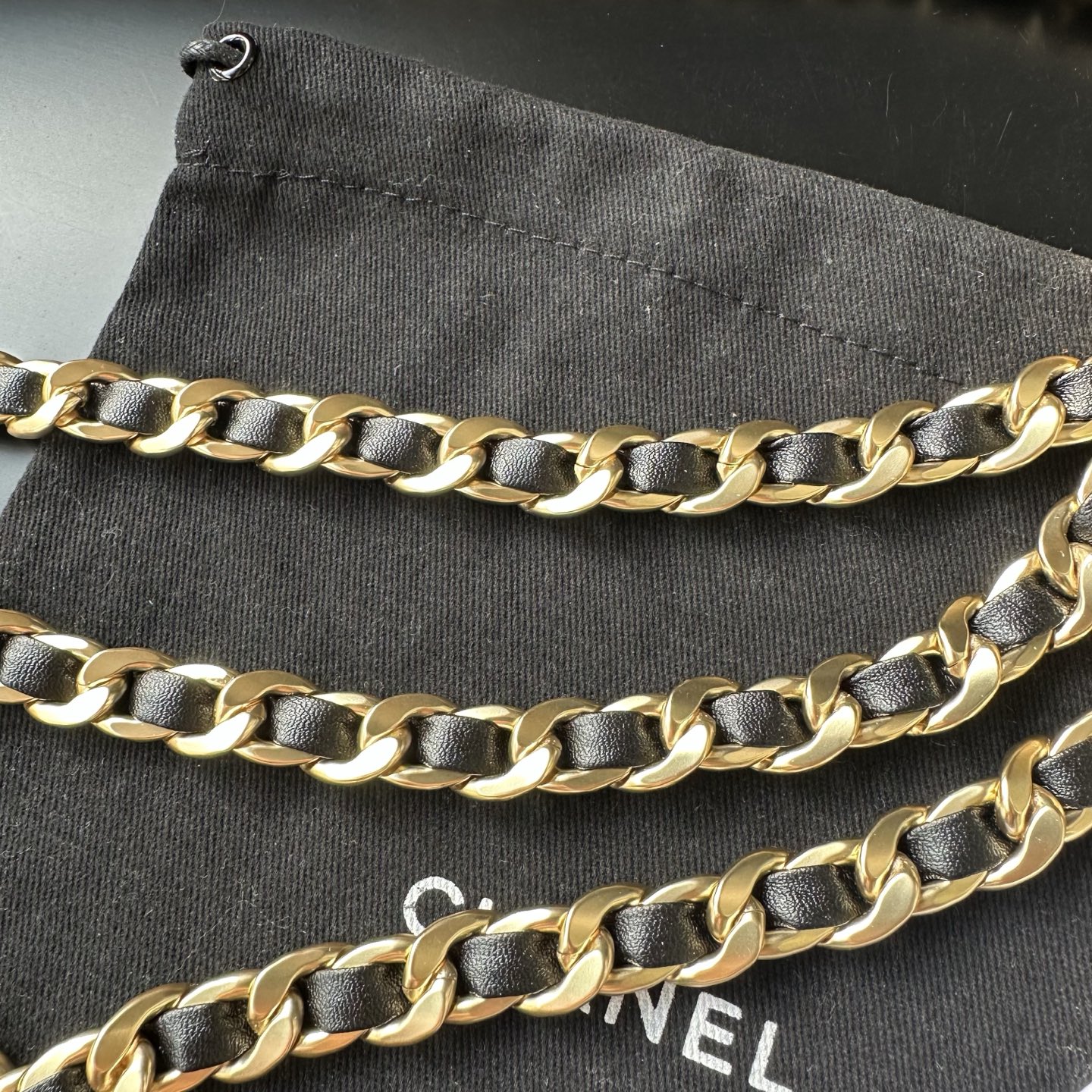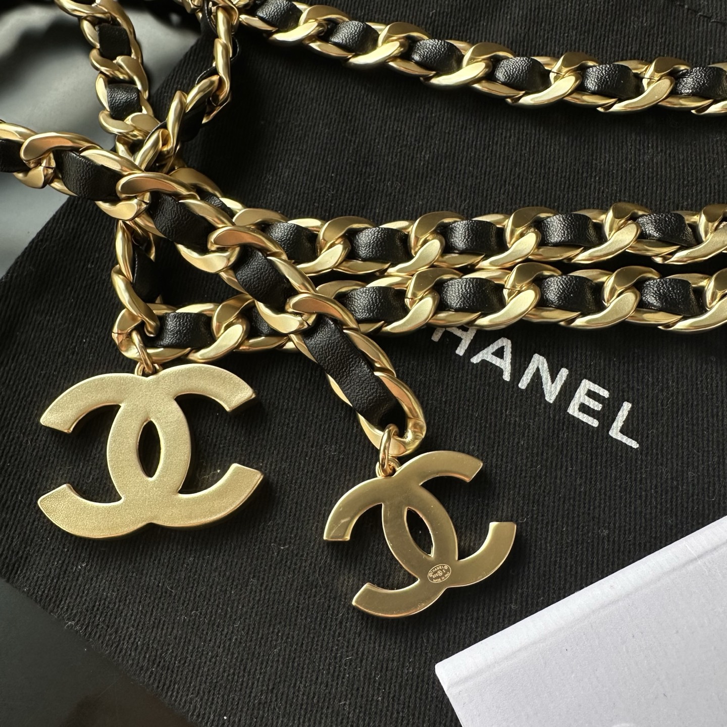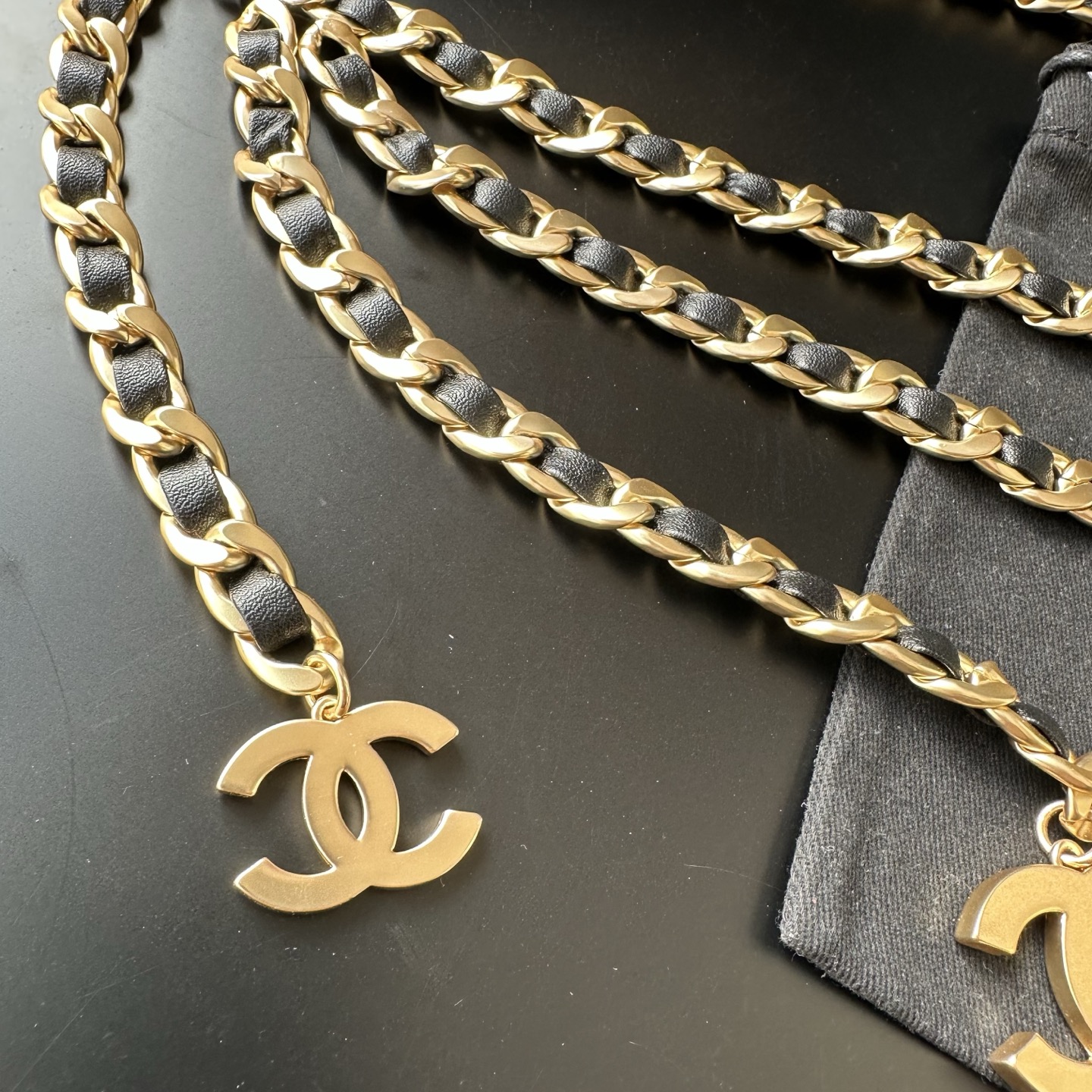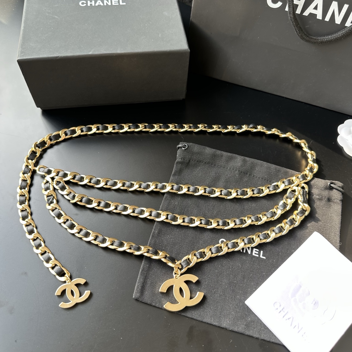 Chanel皮穿链腰链,叠戴氛围感绝了✨ 香奈儿这条三层皮穿链腰链直接美到我失语! 黑金皮穿链的经典搭配,叠戴设计自带层次感,大小双C吊坠戳中审美,复古做旧的金属质感超有味道 系在连衣裙或西装外,瞬间勾勒出腰线,慵懒又贵气的法式氛围直接拉满,香奶奶的配饰果然永远值得入~